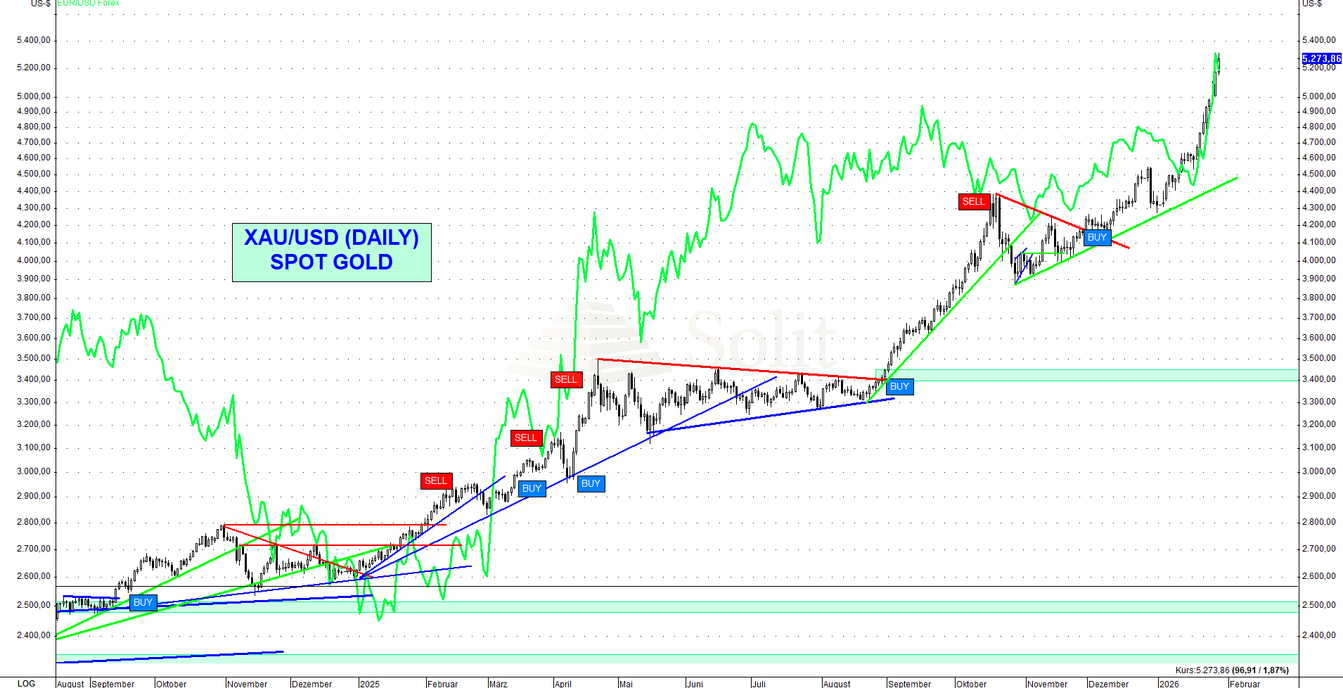 Kurzfristig ist der Anstieg technisch spekulativ überdehnt und bietet auf diesem Niveau eher ein ungünstiges Chance Risiko Verhältnis nach oben, insbesondere auf mittelfristige Sicht. Solange die Rally läuft, kann man trendfolgend weitere technische Ausbrüche aus Konsolidierungsformationen kaufen, allerdings nur mit hoher Disziplin, weil der Markt jederzeit drehen hart korrigieren kann. Genau solche Bewegungen dürften in der nächsten Zeit zur Normalität werden, hohe Volatilität sowohl nach oben als auch nach unten. Der Abverkauf bei Silber am Montag mit einem intraday Rückgang von 15 % zeigt, wie abrupt die Stimmung kippen kann. Für Trader ergeben sich damit auch auf der Short Seite Chancen, allerdings nur, wenn das Timing stimmt und das Risiko strikt begrenzt bleibt, denn Gegenbewegungen können in diesem Umfeld genauso explosiv ausfallen wie die Rally selbst.