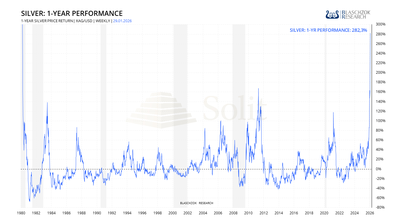 Silber kann mittlerweile eine Jahresrendite von 283% vorweisen, was ebenfalls den stärksten Anstieg seit 1980 darstellt, diesmal nahezu aus dem Stand und binnen weniger Monate, während sich vergleichbare Extremphasen historisch oft über mehrere Jahre aufgebaut haben. Silber tendiert in Aufwärtsphasen dazu, Gold zu hebeln und gerade gegen Ende eines Bullenmarktes überproportional zu laufen, wenn Spekulation und Manie deutlich zunehmen. Der historische Vergleich der Jahresrenditen mahnt deshalb zur Vorsicht, insbesondere am Silbermarkt, weil solche Beschleunigungen selten nachhaltig sind und häufig in eine Phase hoher Volatilität und scharfer Rücksetzer übergehen.