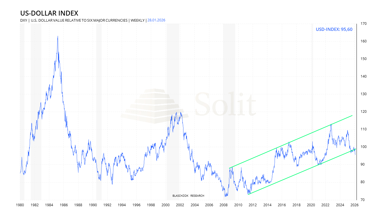 Durch diesen verbalen Eingriff brach letztlich der Aufwärtstrend des USD-Index und nun werden am Markt bereits tiefere Zielbereiche bis in den Bereich um 93 diskutiert. Man sollte nun genau beobachten, ob der US-Dollar tatsächlich weiter abgibt oder sich erholen und das Ausbruchsniveau zurückerobern kann. Letzteres wäre extrem bullisch und könnte den Anfang einer Rallye bis in den Bereich um die 120 Punkte nach sich ziehen in den nächsten 12-18 Monaten. Ein stärkerer US-Dollar würde das Narrativ des Debasement-Trades unterminieren und könnte das vorübergehende Ende bzw. eine Pause der historisch starken Rallye der Edelmetalle einleiten. Die weitere Entwicklung des USD-Index ist also kurzfristig äußerst interessant für Trader und Investoren am Gold- und Silbermarkt.