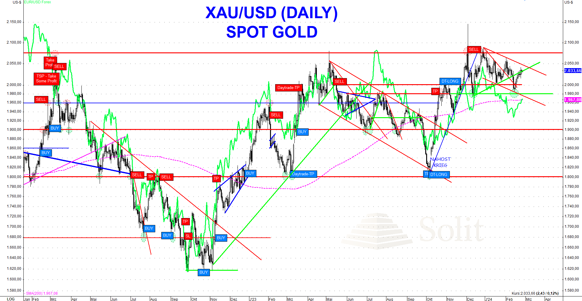 Der Goldpreis übersprang daraufhin am Freitag den Abwärtstrend bei 2.055$ mit einem folgenden Anstieg auf das Allzeithoch und den Widerstand bei 2.080$.