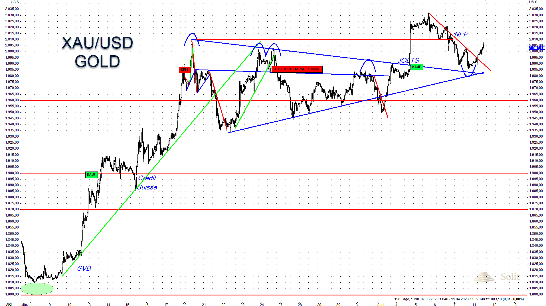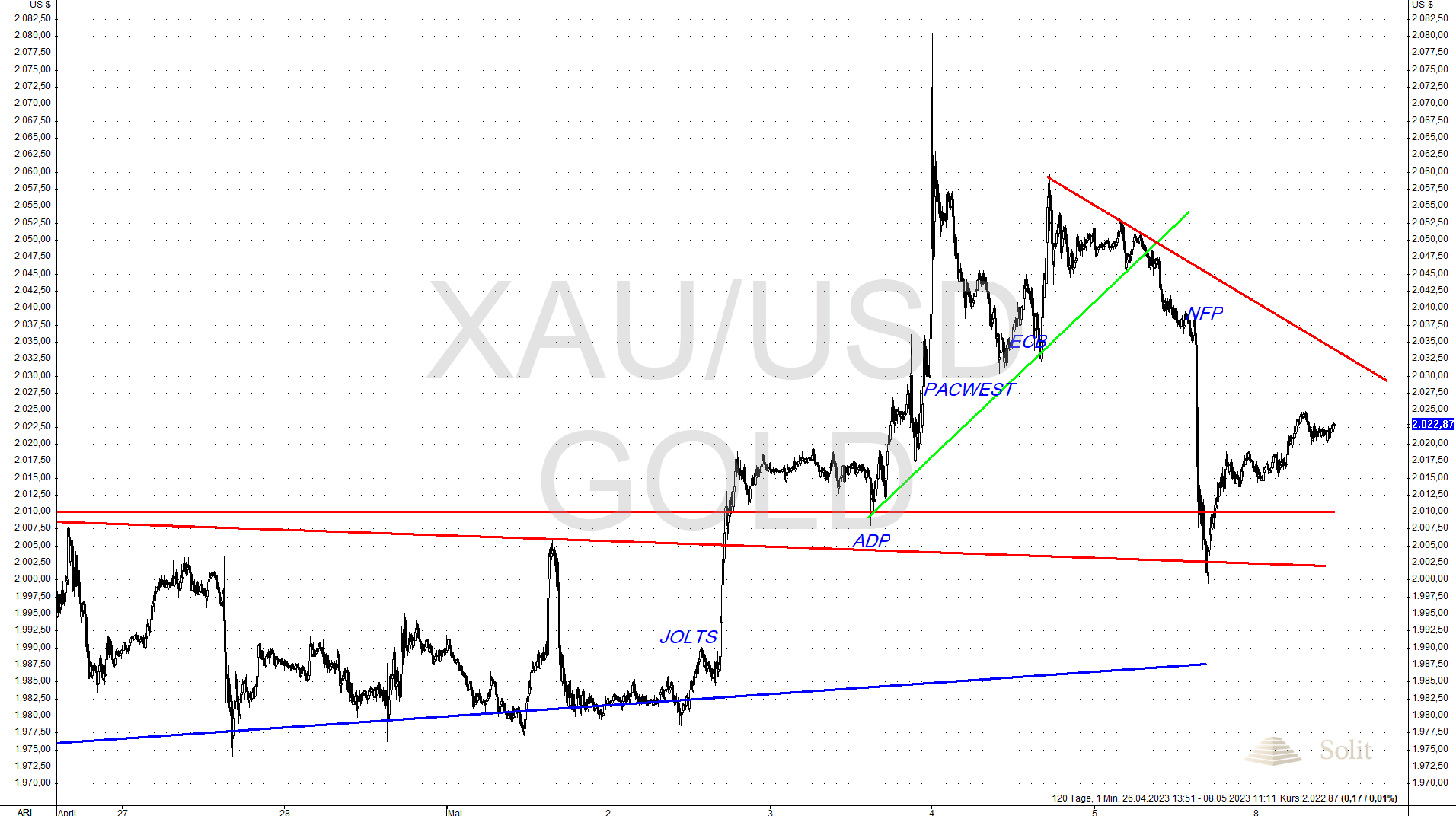 ... und Minuten später erneut Panik aufkam und der Goldpreis um 70$ auf ein neues Allzeithoch bei 2.080$. Die Aktienkurse weiterer Regionalbanken brachen infolge der Bloomberg-Meldung stark ein.
