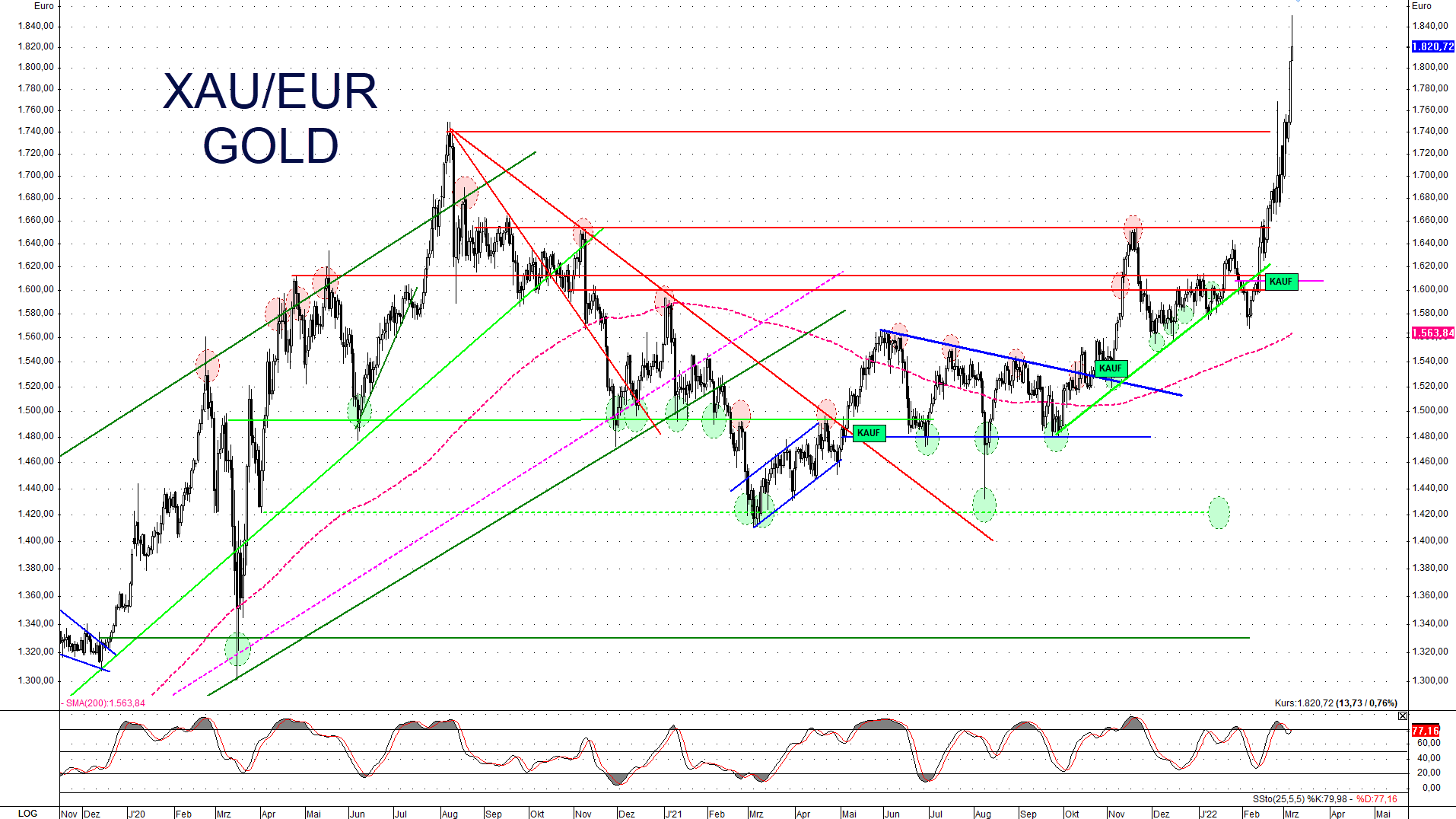 Der Goldpreis stieg heute Morgen erstmals wieder auf 2.000 US-Dollar, dem höchsten Stand seit August 2020, wogegen der Goldpreis in Euro längst auf ein neues Allzeithoch bei 1.851 Euro kletterte. Seit Anfang 2014 stieg der Goldpreis in Euro bereits u...
