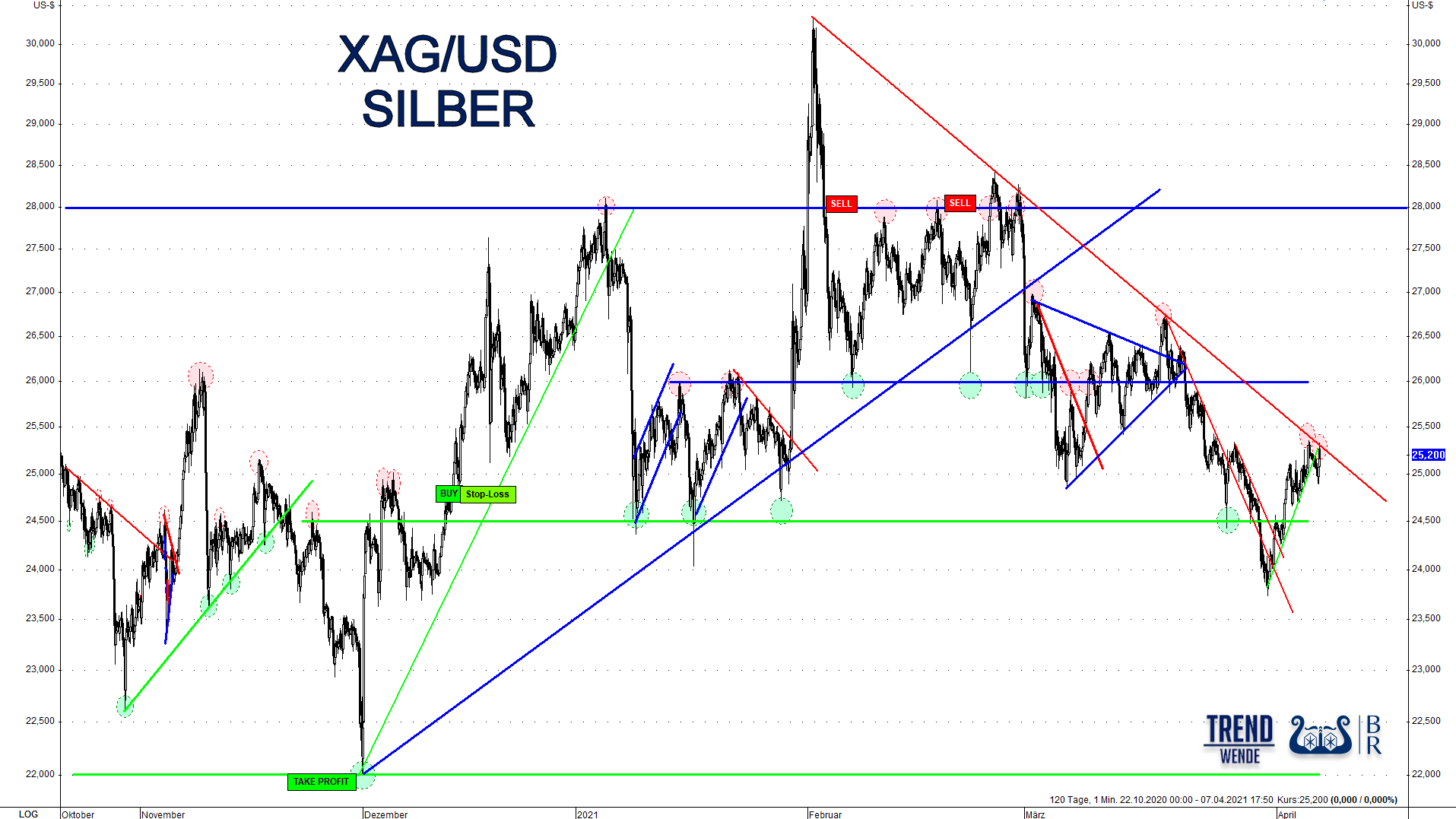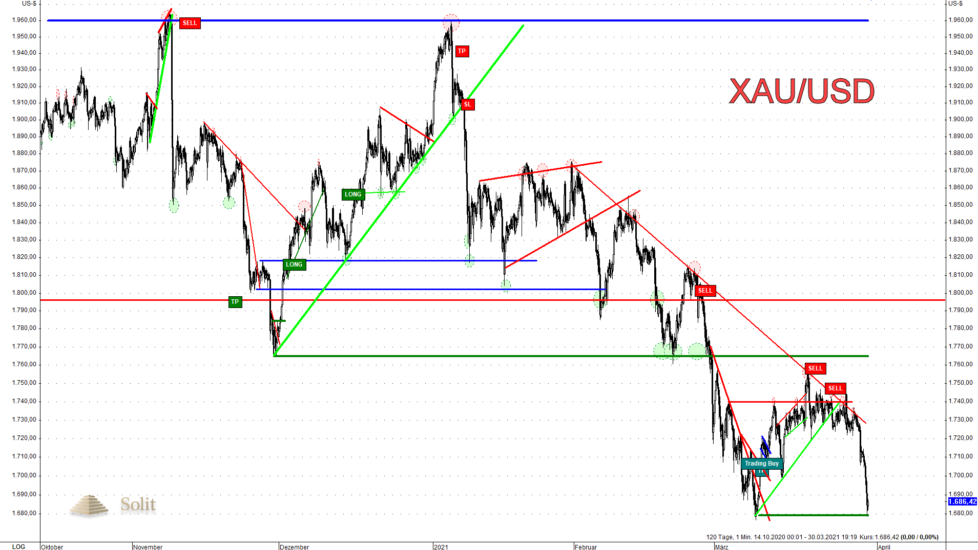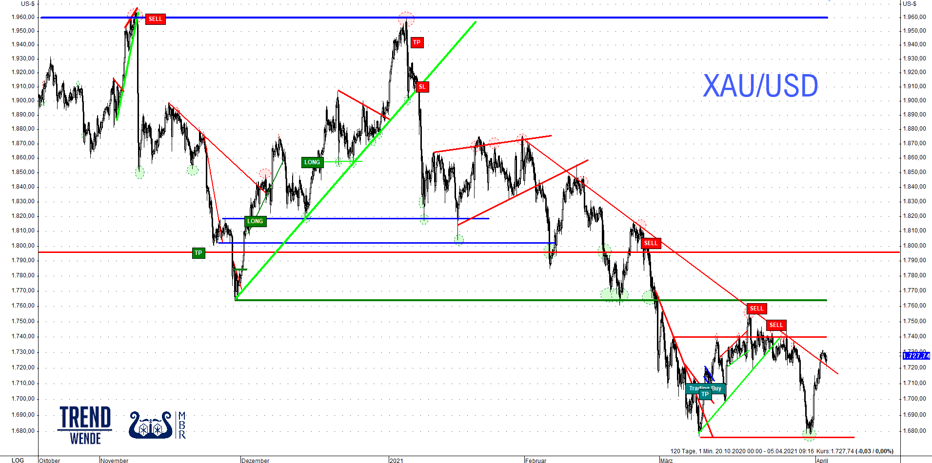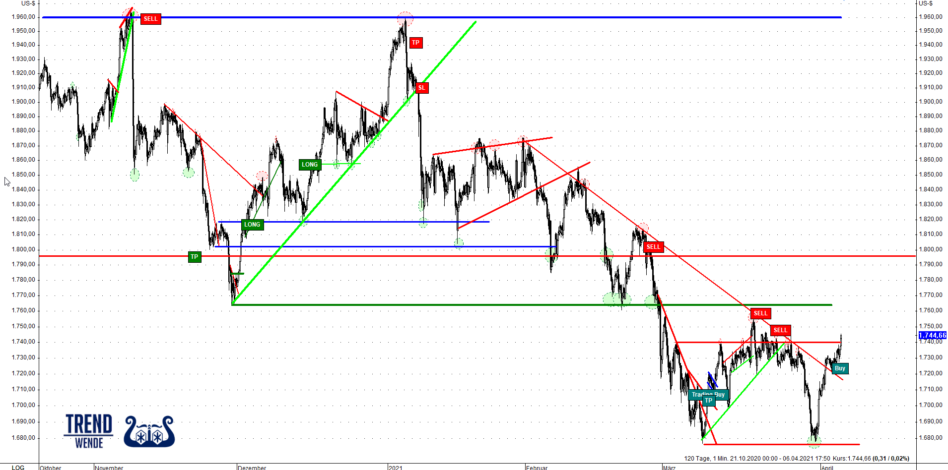 Im Moment kämpft der Goldpreis an dem Widerstand bei 1,741 USD. Darüber ist Luft bis 1.765 USD, was jedoch noch einmal ein starker Widerstand ist.