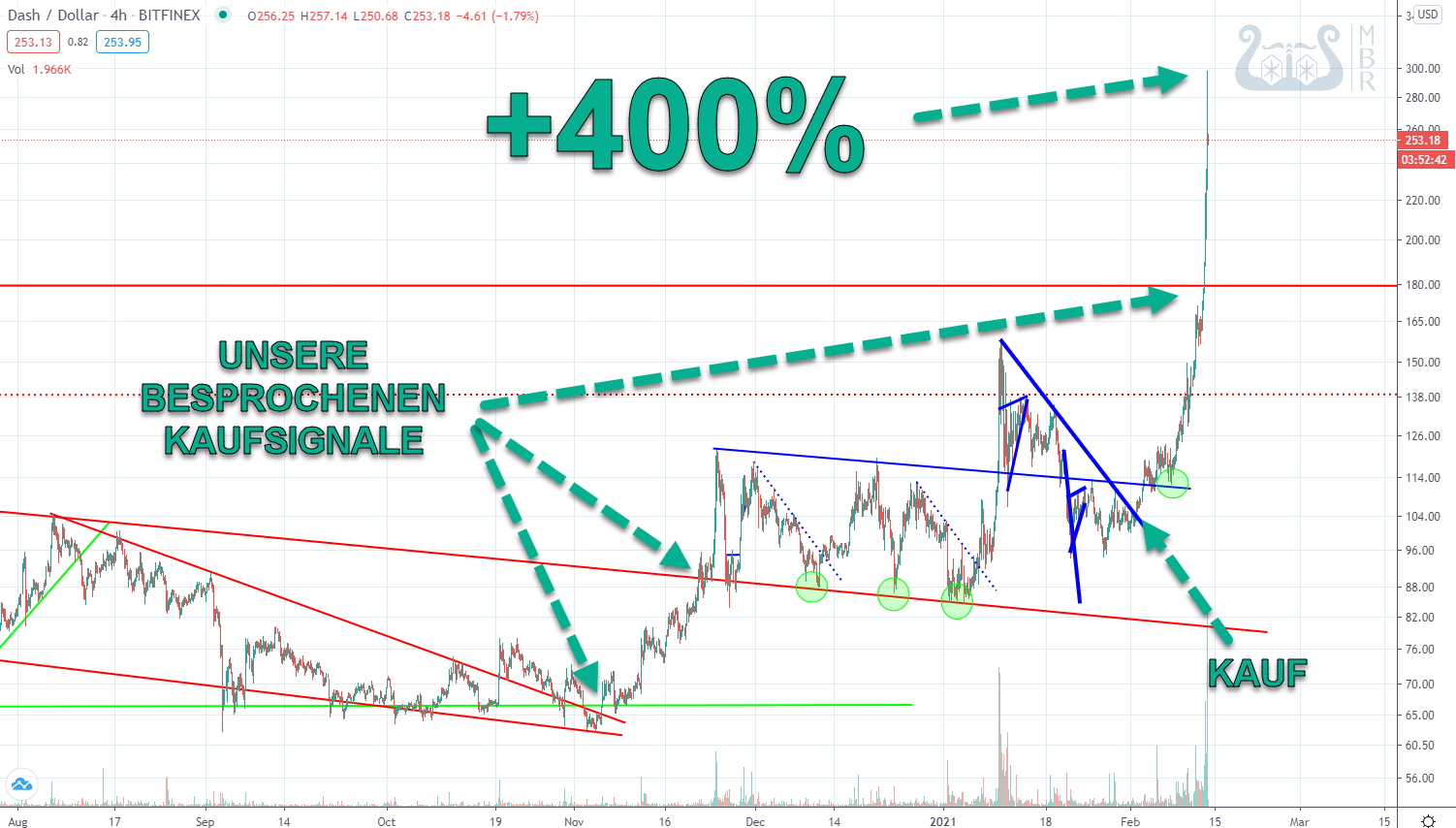 Dash war heute auf 298 US-Dollar im Top angestiegen. Die Kaufempfehlung für Dash gab ich damals bei rund 60$ und in der letzten Ausgaben von Trendwende zeigte ich noch, dass es über dem Widerstand bei 170$ zu einem schnellen Anstieg ko...